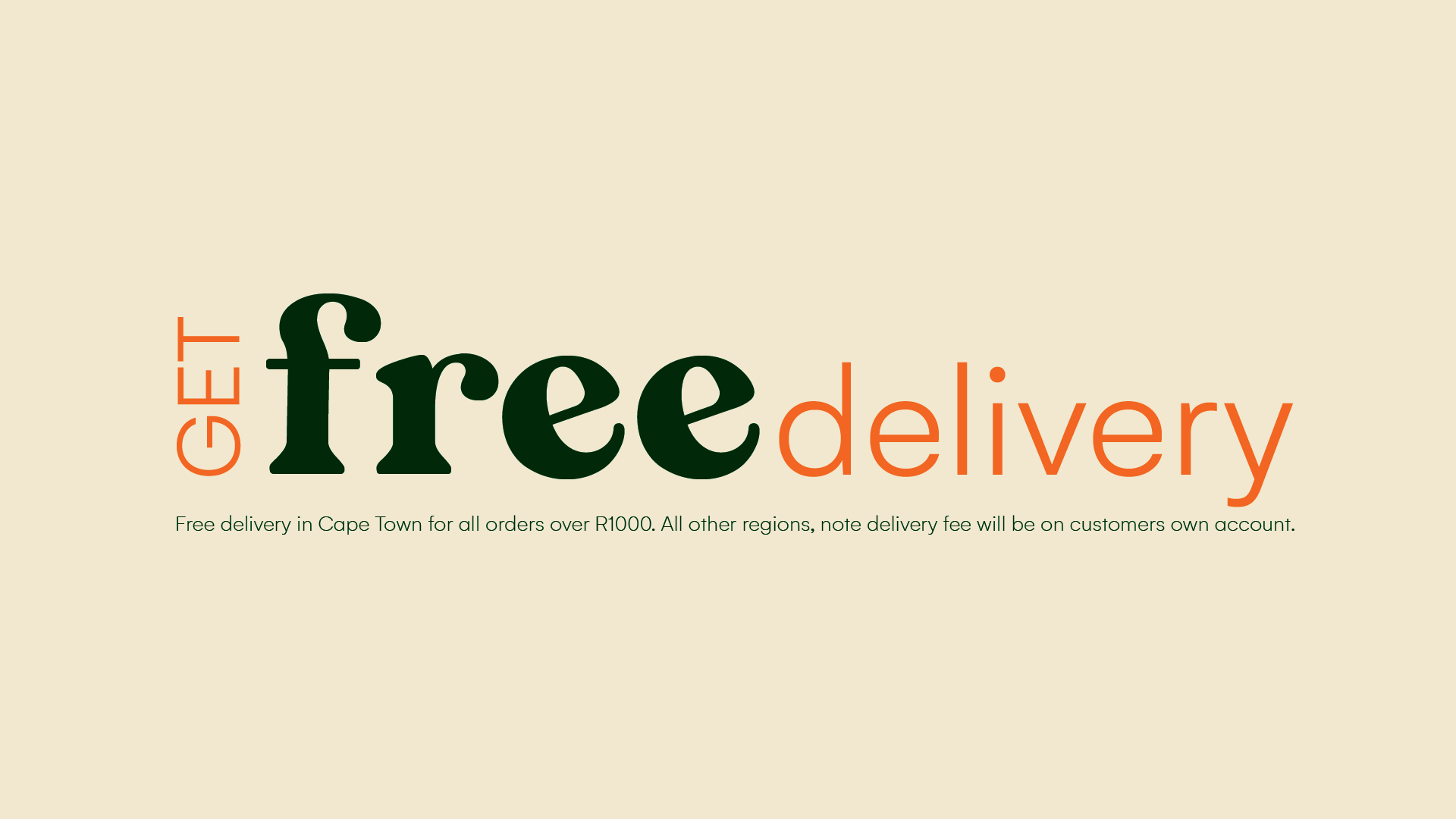 Free delivery for all orders in Cape Town over the value of R1000. All other regions/areas, note the delivery fee will be on customers own account.